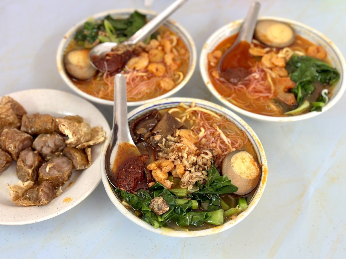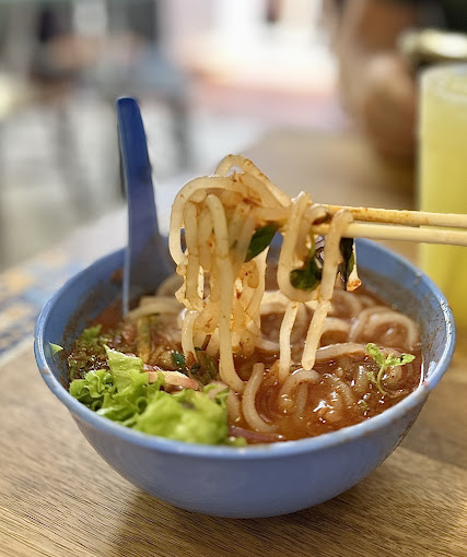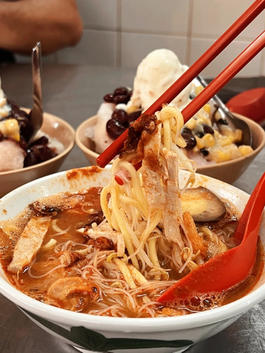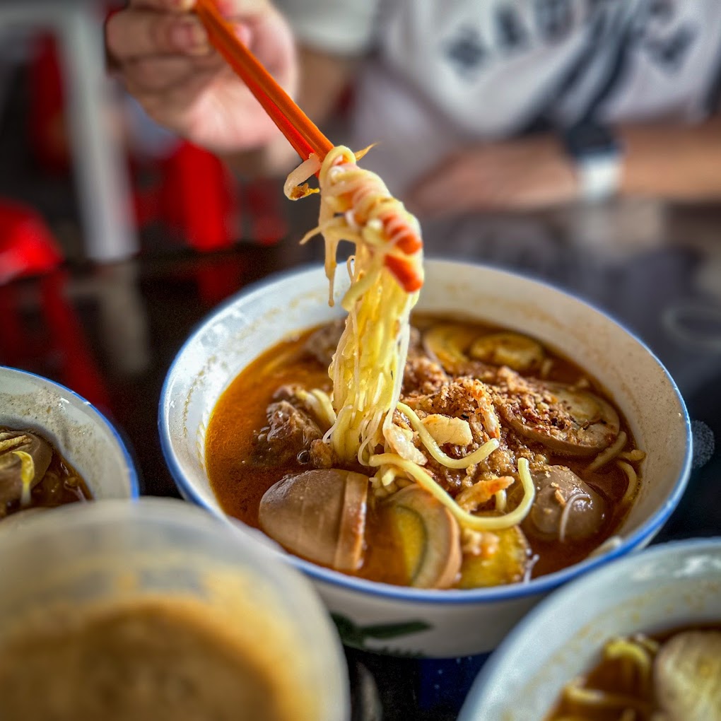 以虾壳和大骨熬出的红亮汤头,是槟城人早餐必备。辣中带鲜,配上烧肉、卤蛋、排骨都超对味!