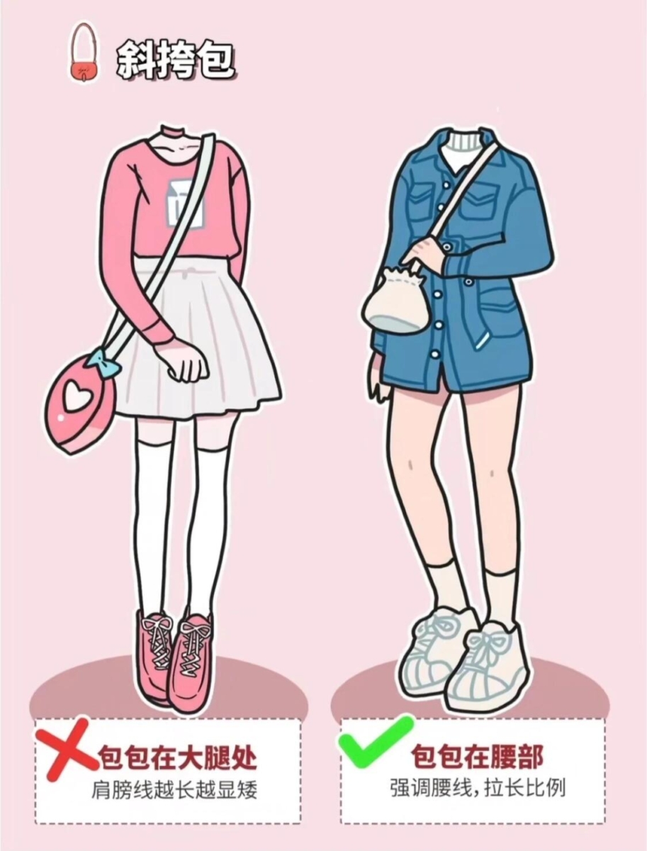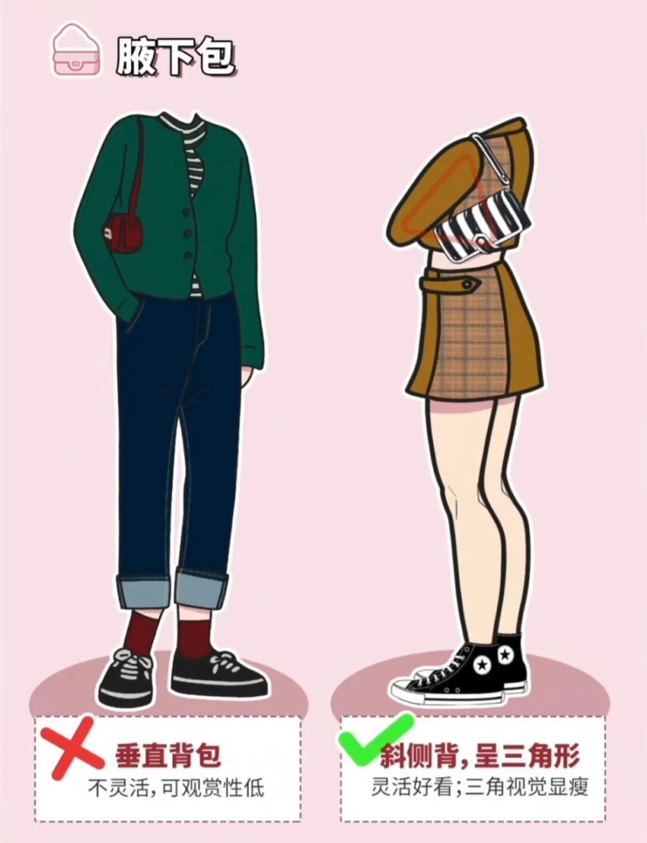双肩背包通常更实用,适合需要携带较多物品的场合,如上学或旅行。但切记千万不要背包比臀部低,书包面积大肩带低,容易显矮。正确背法应该在胯部附近,即可减少占有腿部视线,显高更好看。