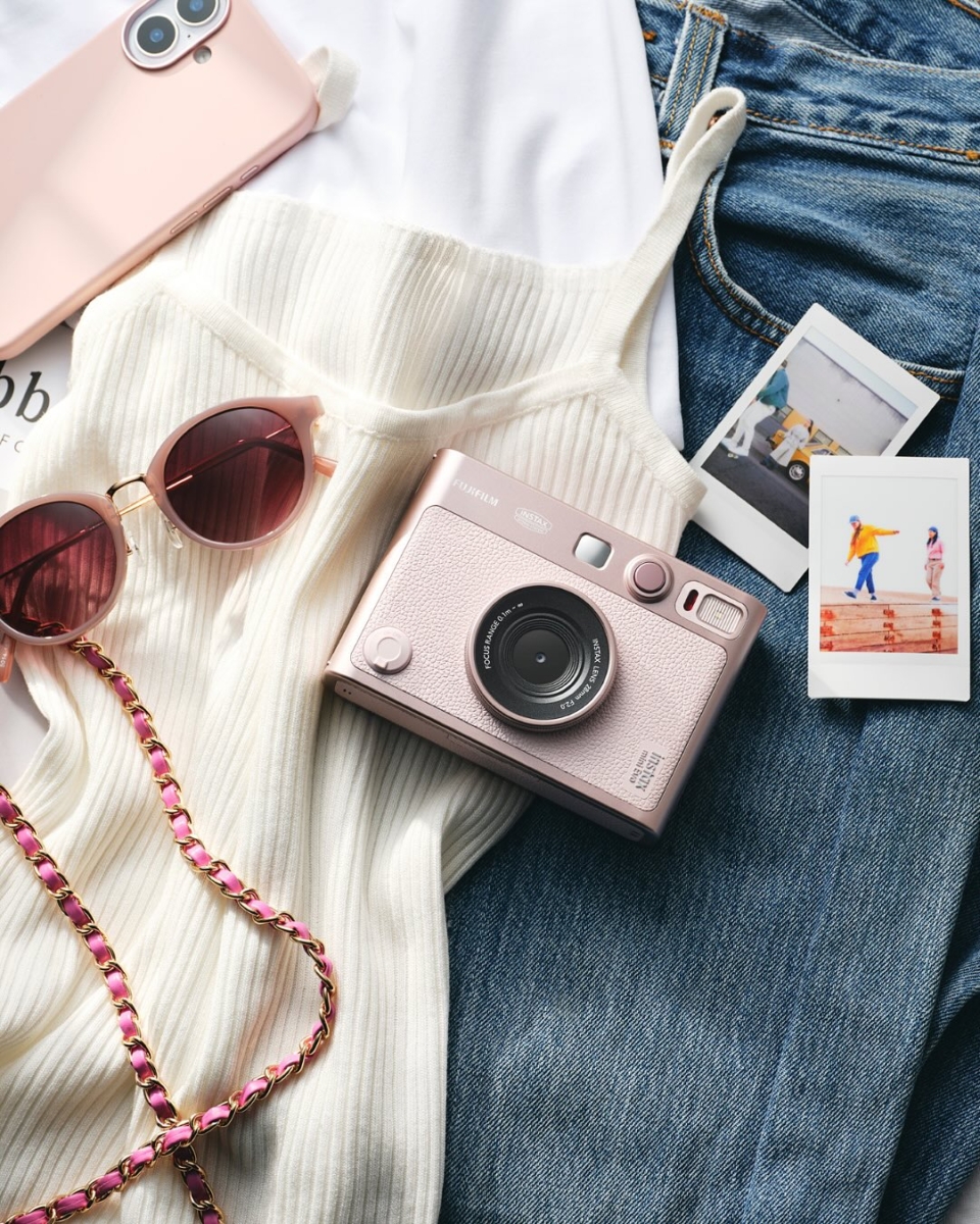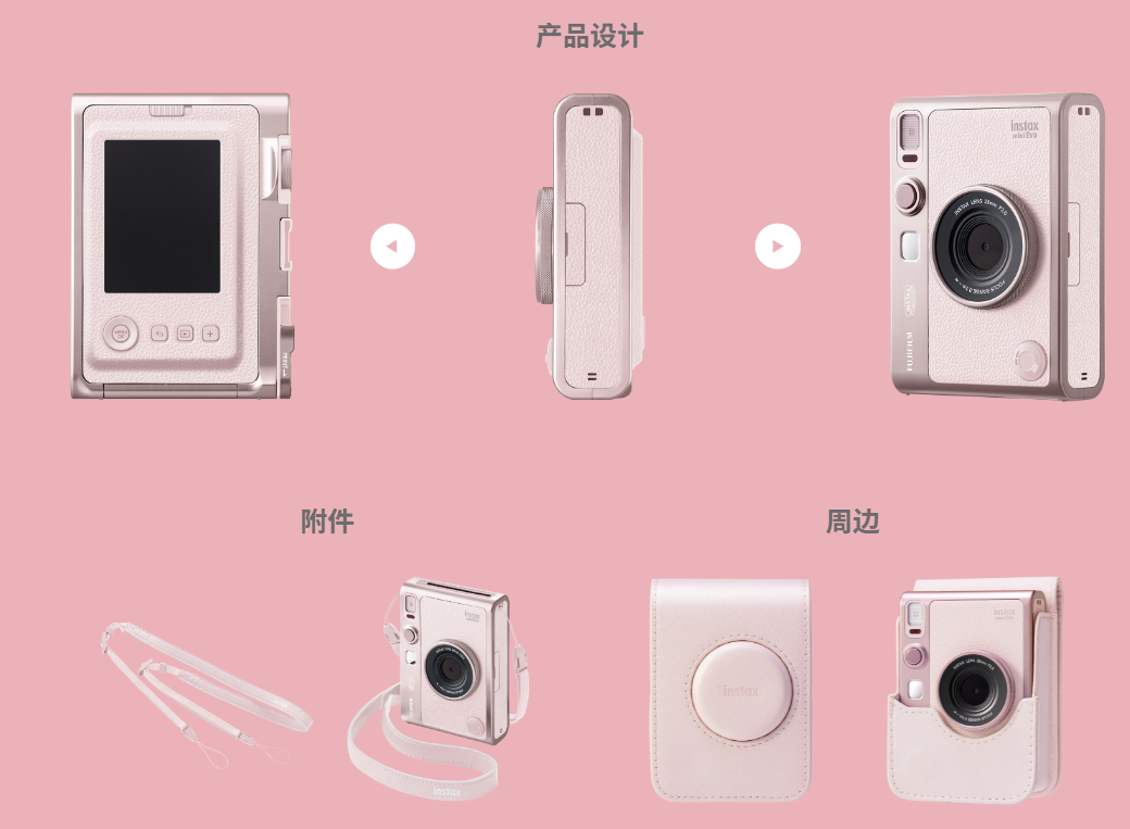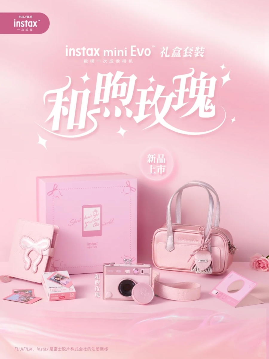 富士 instax mini Evo™ 再度升级!这次推出全新配色——Gentle Rose(和煦玫瑰),粉嫩中透着香槟金光泽,柔和又不失质感。这款温柔色调一亮相就让人心动,从机身到配件都带有细腻的金粉光泽,像阳光洒在玫瑰花瓣上的感觉。过去的mini Evo以棕色、黑色为主打的复古风,今年粉色版本一上市便引发热潮,如今这款全新玫瑰粉更显优雅,“甜而不腻”的高颜值直戳少女心🎀