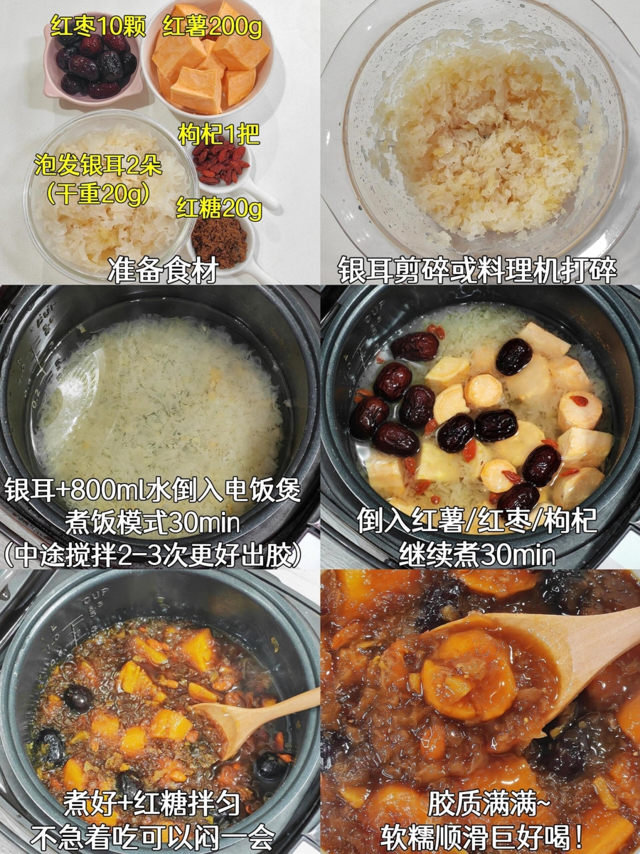 先把泡发银耳剪碎(更容易出胶),加水煮分钟,中途搅拌几次。接着加入红薯、红枣、枸杞继续煮半小时,最后加点红糖搅匀。煮好后可以焖分钟,吃的时候是浓稠顺滑的美容汤!