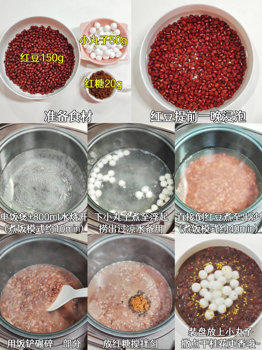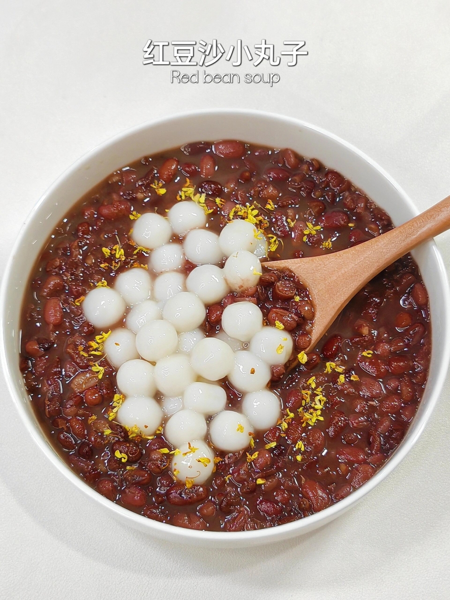 红豆提前泡一晚。电饭煲加水煮至出沙(左右),加入红糖搅匀。糯米丸子煮至浮起后捞出,放在红豆沙上~喜欢香气的还可以撒一点干桂花,氛围感立马拉满。