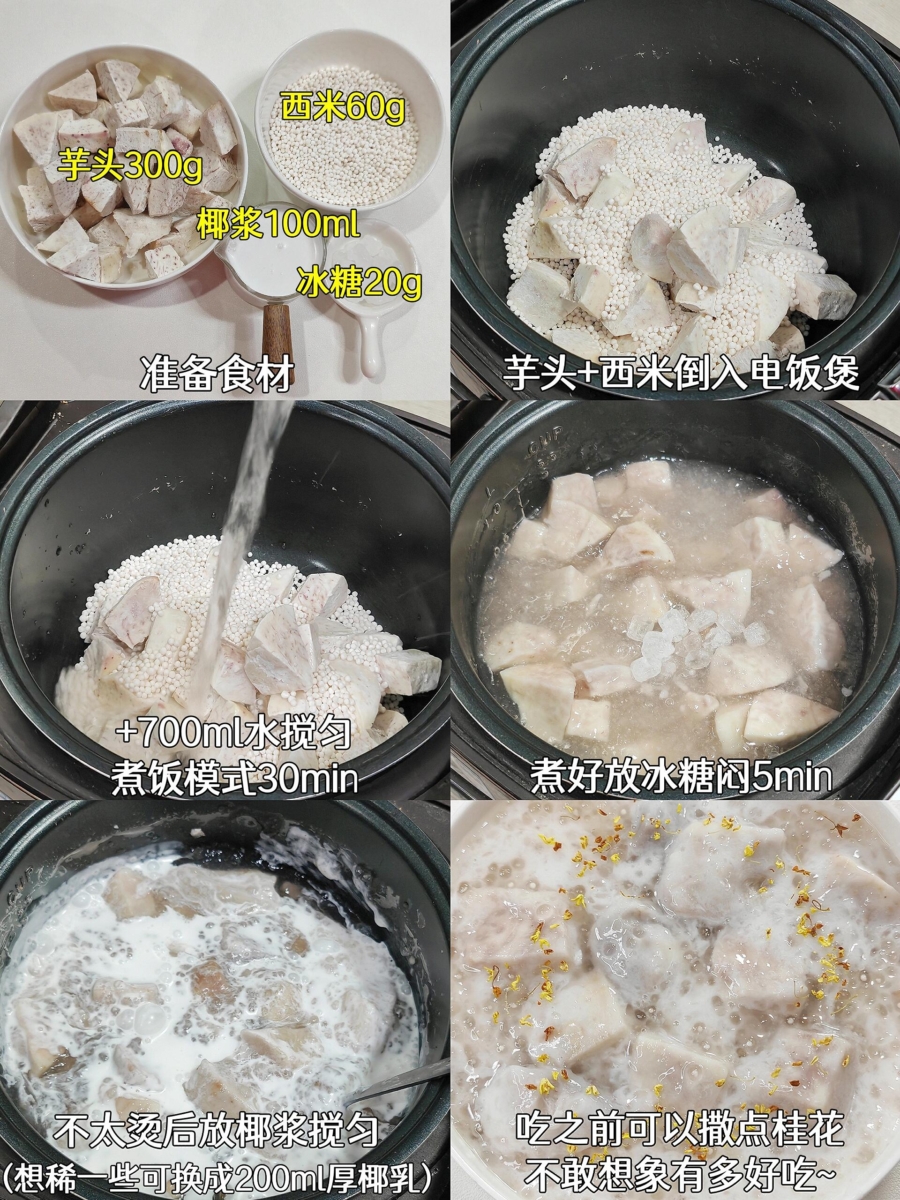 把芋头、西米、水放入电饭煲煮分钟,放入冰糖再焖分钟。放凉后倒入椰浆搅匀(想更浓郁可以换厚椰乳),冷藏一下更好喝!