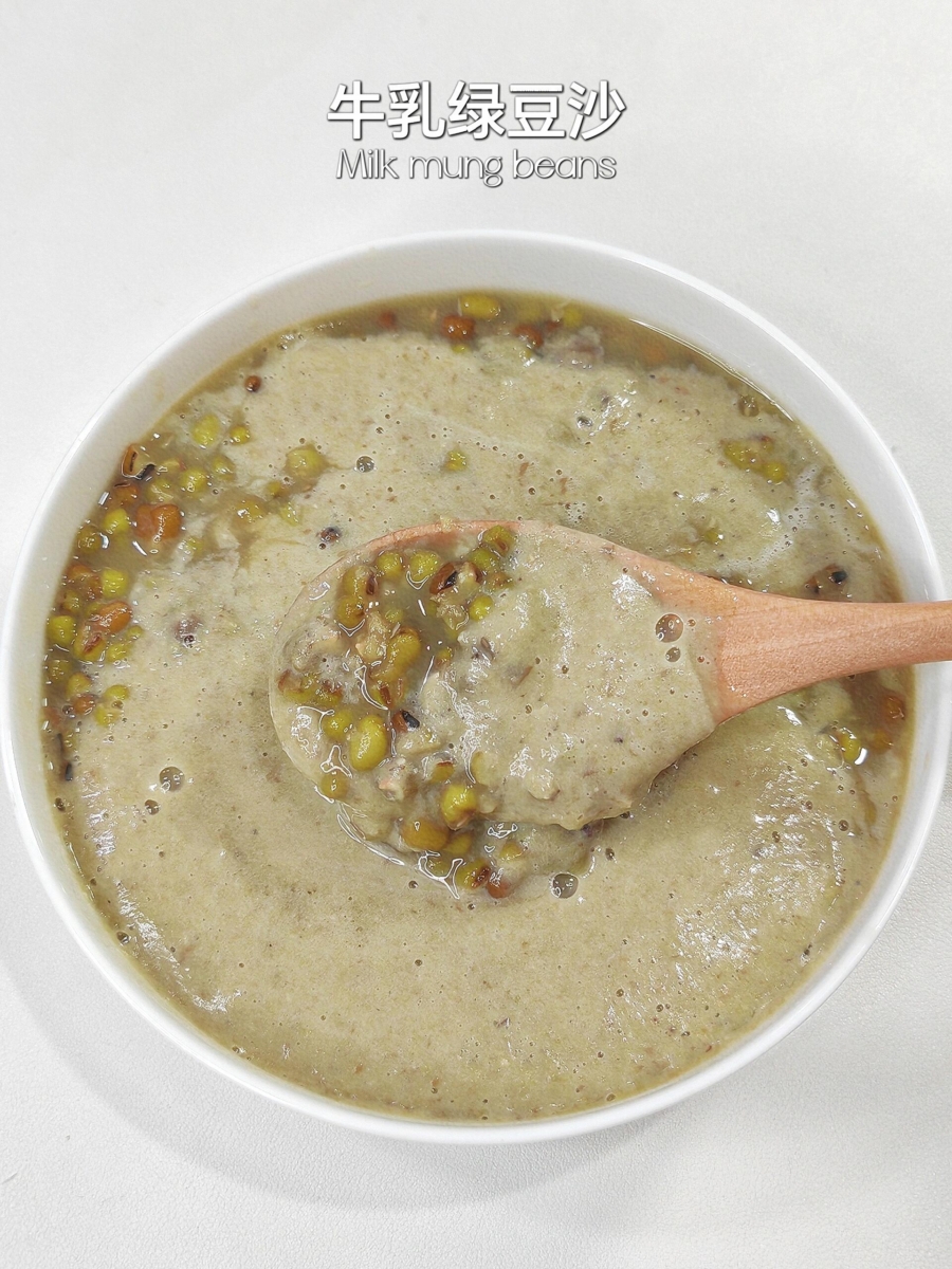 绿豆泡一晚后和水煮分钟,放冰糖搅匀。取一半豆和奶粉打成糊,再倒回去混合。夏天放冰箱冷藏,简直是奶香绿豆冰沙既视感!