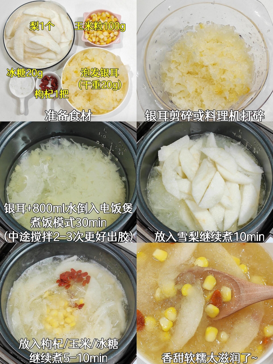 银耳剪碎煮分钟,再加入雪梨煮分钟,最后放枸杞、玉米、冰糖煮分钟即可。香甜不腻,温润滋补,办公室午后来一碗超幸福。