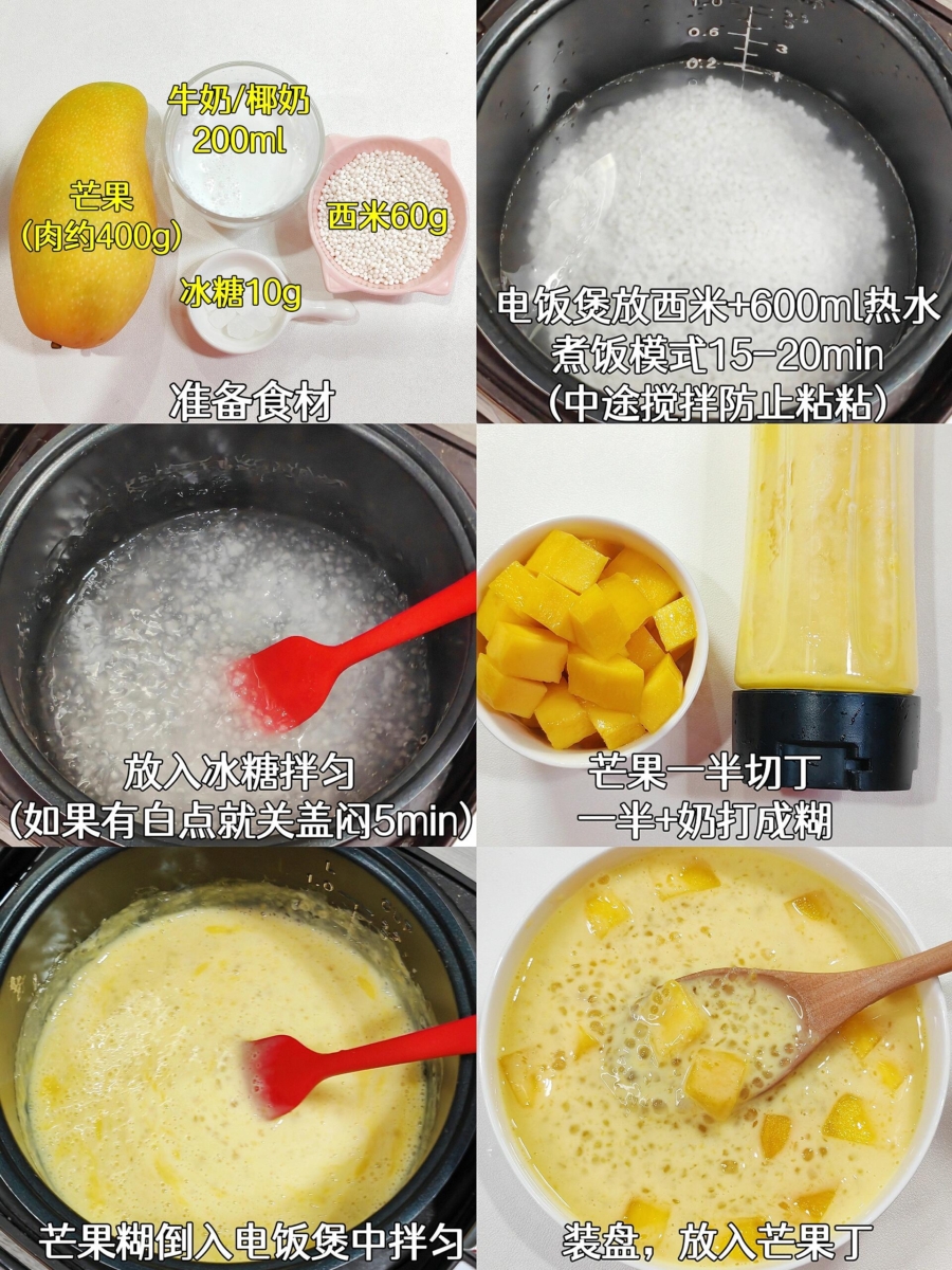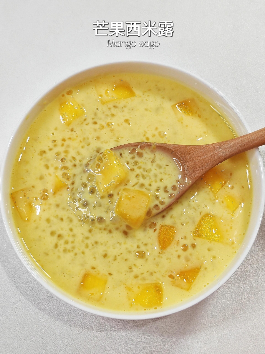 西米煮至透明后加冰糖焖分钟。芒果一半打成泥、一半切丁,和牛奶椰奶混合后倒入西米中。一口下去,果香和奶香爆开~