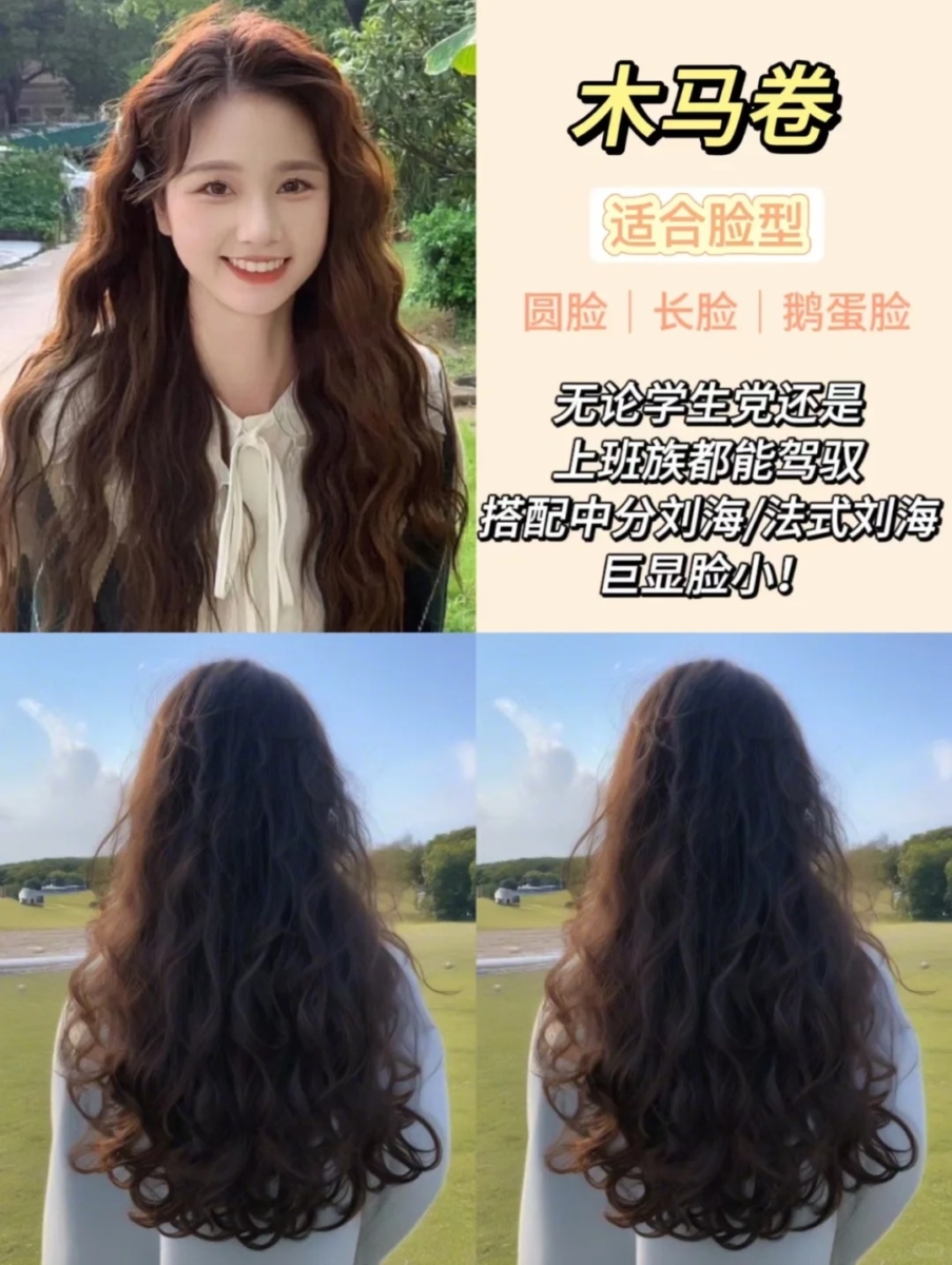 章若楠在《难哄》里的卷发就是这款木马卷啦~ 木马卷的卷度则比较流畅和柔和,自带满满的温柔氛围感,优雅有气质~ 它一般从头发中部开始卷曲,纹理丰富,发丝灵动,看起来时髦感十足!木马卷适合圆脸、长脸和鹅蛋脸,搭配 中分刘海或法式刘海更显脸小哦~