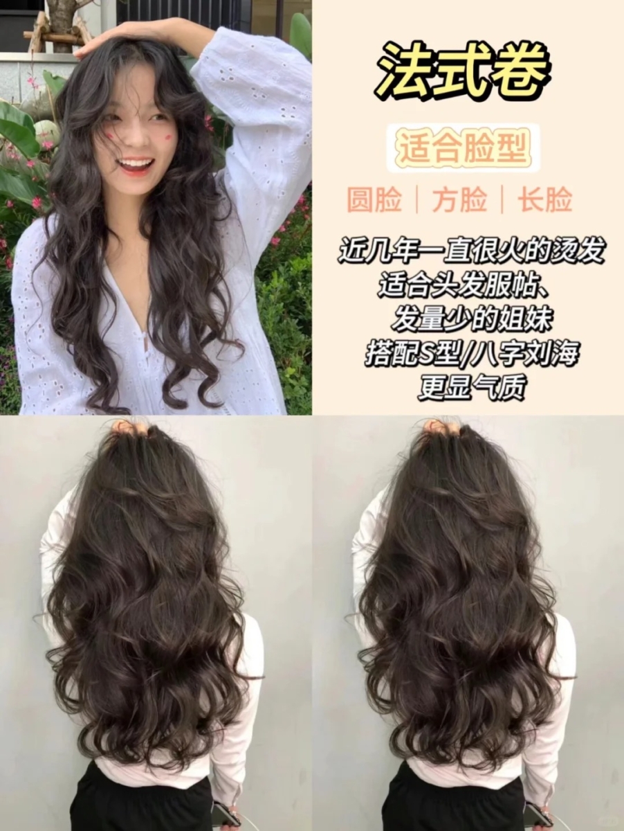 除了木马卷之外,相近的“法式卷”也很适合发量比较少的姐妹!法式卷的卷度更密集,从发根延伸到发尾,让你体验发量翻倍的快乐!而且这款卷发的层次感丰富,不仅可以让发量看起来倍加丰盈,还能很好地修饰头型,让细软塌女孩也能变成发量王者,并打造优雅的慵懒气息~