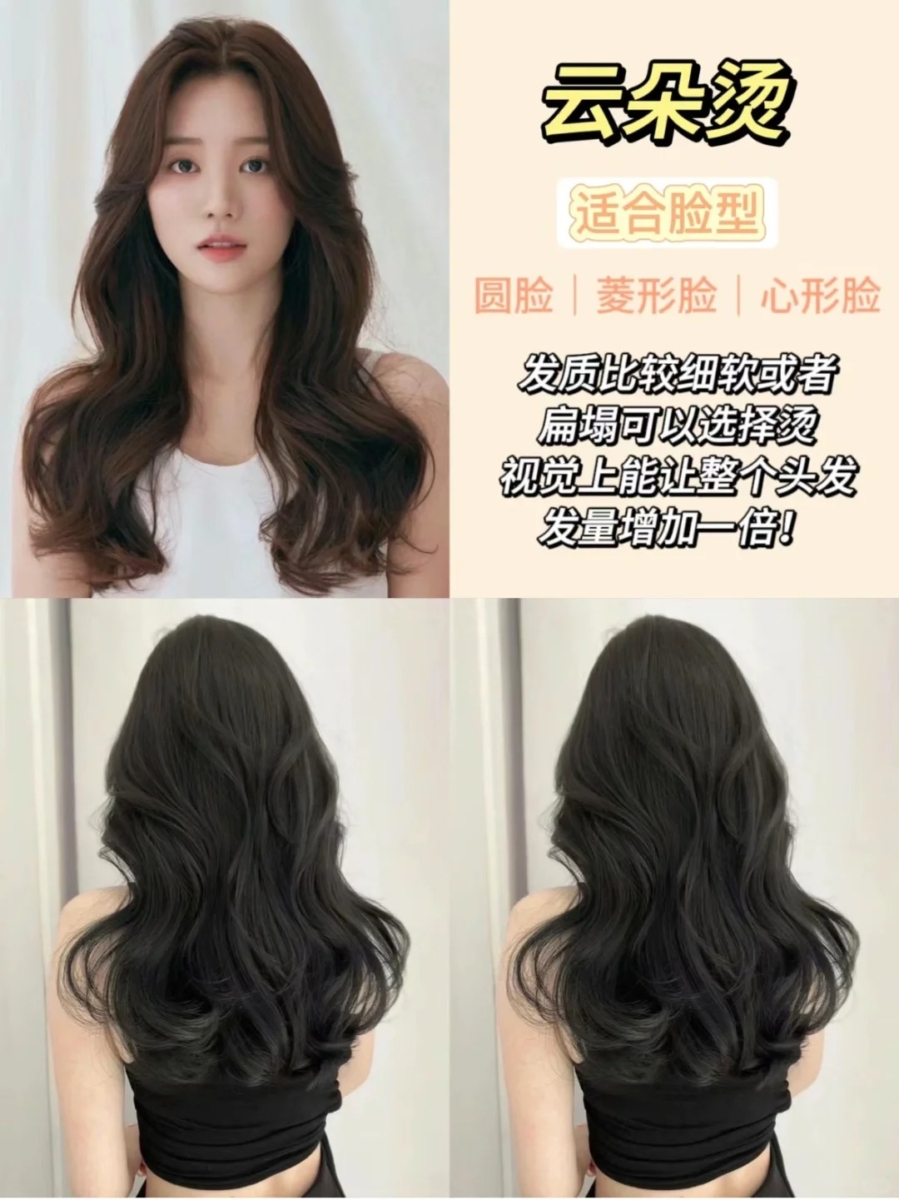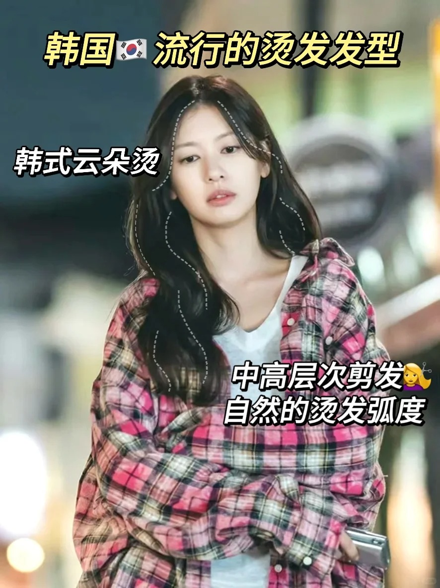 “云朵烫”是这一两年很流行的韩式烫发发型,它的弧度自然、柔和,如云朵般轻盈,松弛感轻松拿捏。人气韩剧《妈妈朋友的儿子》女主角「庭沼玟」就是这个发型哦!发尾的卷度精致又有氛围感,搭配耳后双 C 浏海显脸小,不同脸型的女孩都能尝试!
