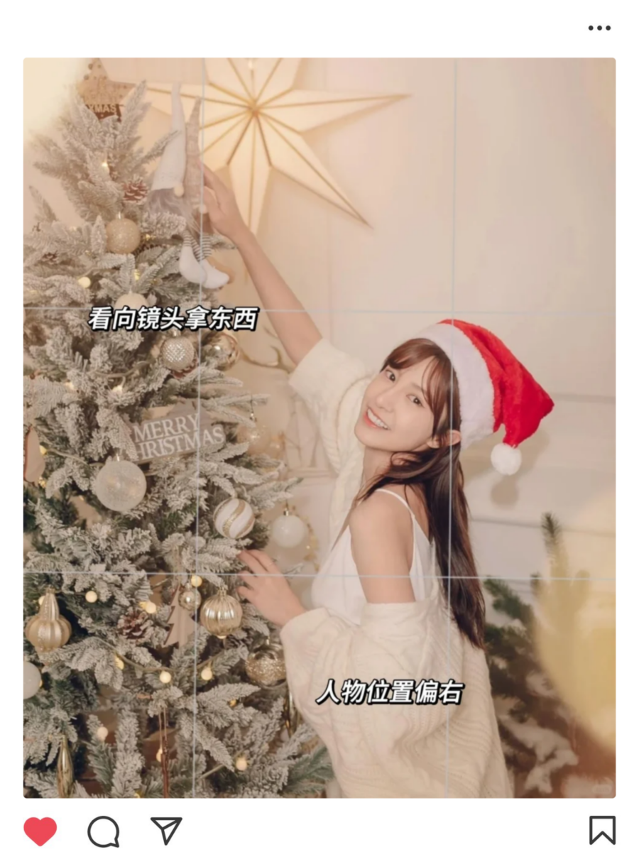 想要和圣诞树亲密合影?试试这个构图:让圣诞树占据画面左边的两格,人物占据右边一格。稍微抬头凑近圣诞树的枝叶,利用树枝作为前景遮挡一点脸部轮廓,不仅显脸小,还能拍出满满的互动感。