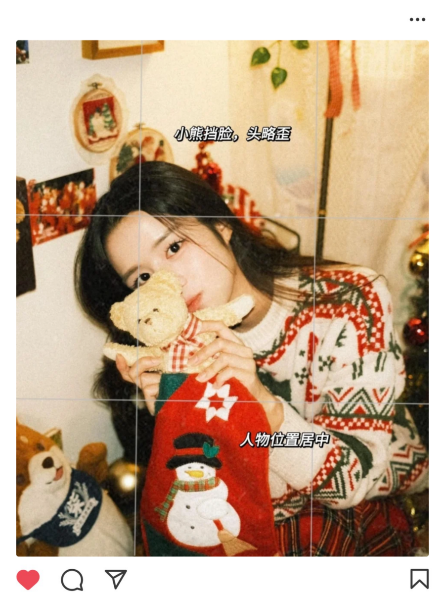画面上方留出一格的空白(留白),人物位置居中偏下。手里拿一只可爱的圣诞小熊或姜饼人挡住半张脸,头微微歪向一边。这个姿势不仅可爱爆表,还是遮肉显脸小的绝佳拍照技巧!