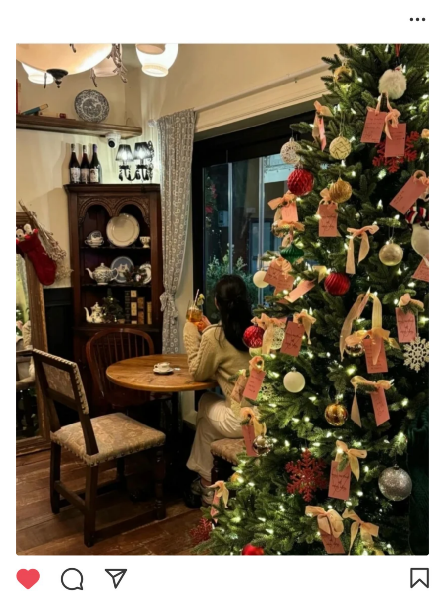同样是餐厅场景,如果还是觉得尴尬,那就利用手边的杯子!人物比圣诞树靠前,让树只露出边缘作为点缀。拿起杯子假装喝水或看向窗外,完全不用理会镜头。这是非常实用的I人拍照姿势,轻松拍出文艺范。