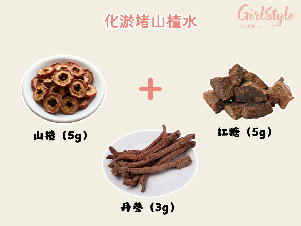 山楂片 5g,丹参 3g加入适量红糖(约 5g)开水冲泡后温热饮用