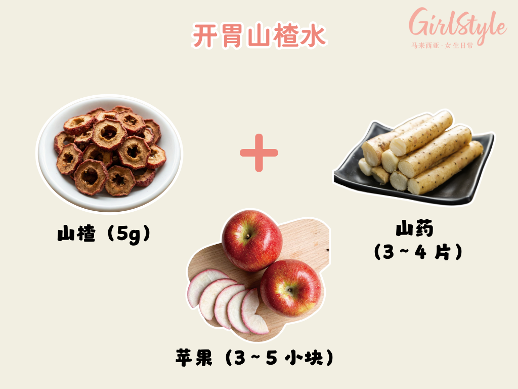 山楂片 5g苹果 3~5 小块山药 3~4 片(鲜/干均可)加热冲泡或小火煮 5 分钟