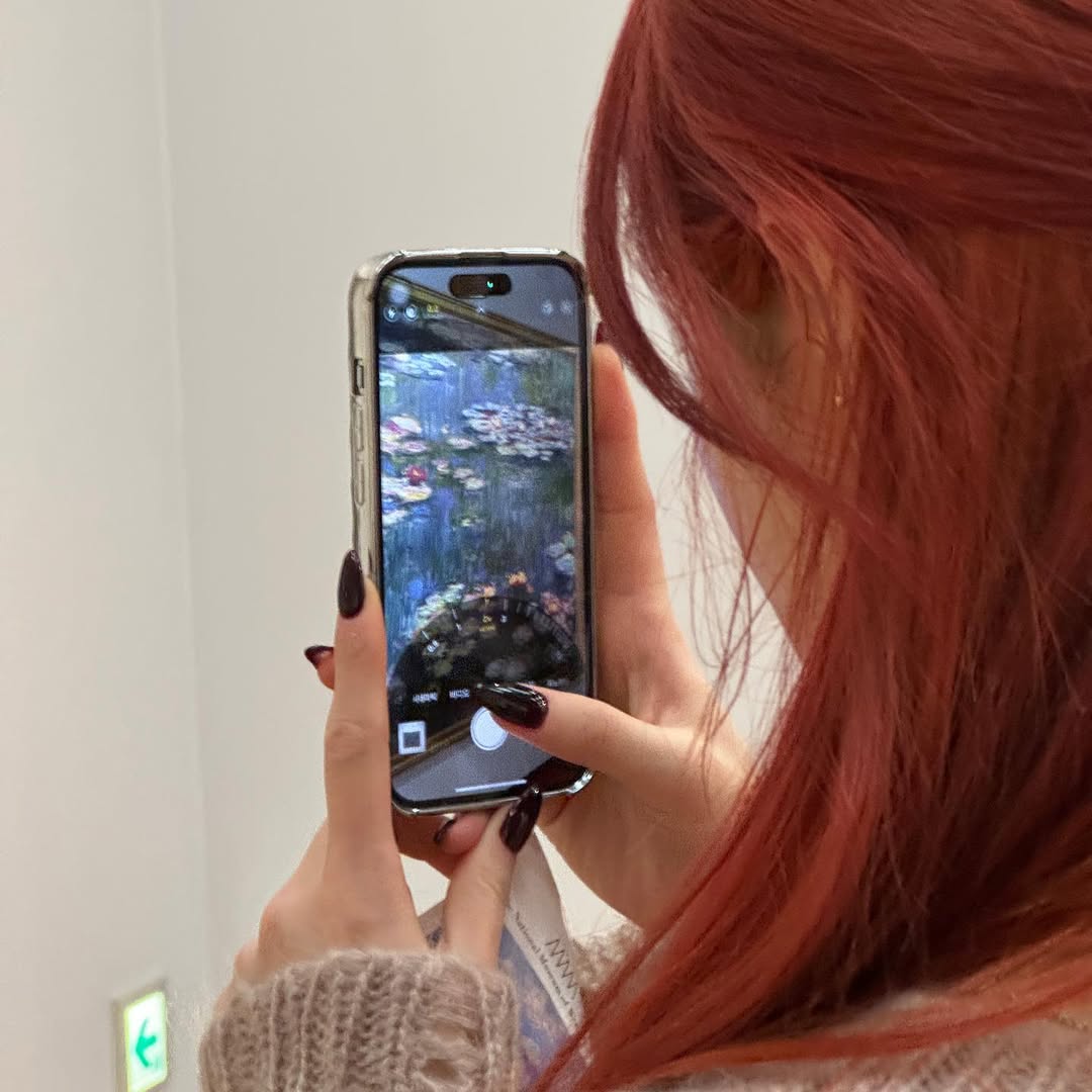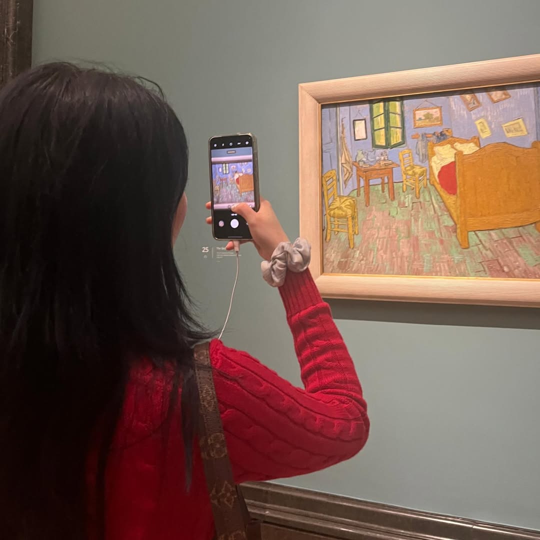 如果你不想出现正脸,那就让朋友站在你后面,拍下你举起手机拍作品的那一刻。这种照片会有一种此刻的我真的在认真欣赏艺术的真实感。