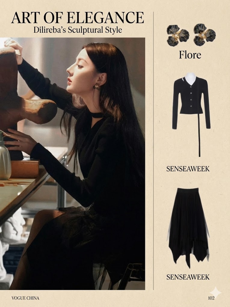 黑色针织紧身开衫勾勒身形,不规则纱裙增加戏剧张力。黑色花耳环在全黑背景里闪一下,美得有点危险。甜+冷+艺术感,一整套都写着“别靠太近”。