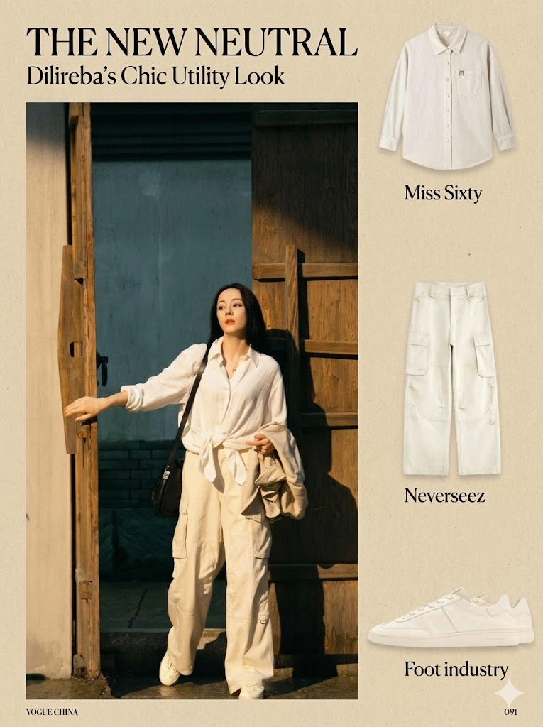 Miss Sixty 的白衬衫人人都有,但热巴把下摆随手打结,腰线直接飞升。配工装裤+小白鞋,一身白+米白,干净又耐看。适合周末、旅行、郊游,怎么拍都像杂志封面。