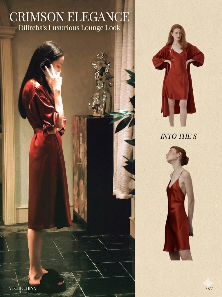 INTO THE S 的酒红真丝套装,就是人间富贵花本花。外长内短的穿法若隐若现,性感得不吵闹、贵得刚刚好。灯光一暗,人直接变天菜。