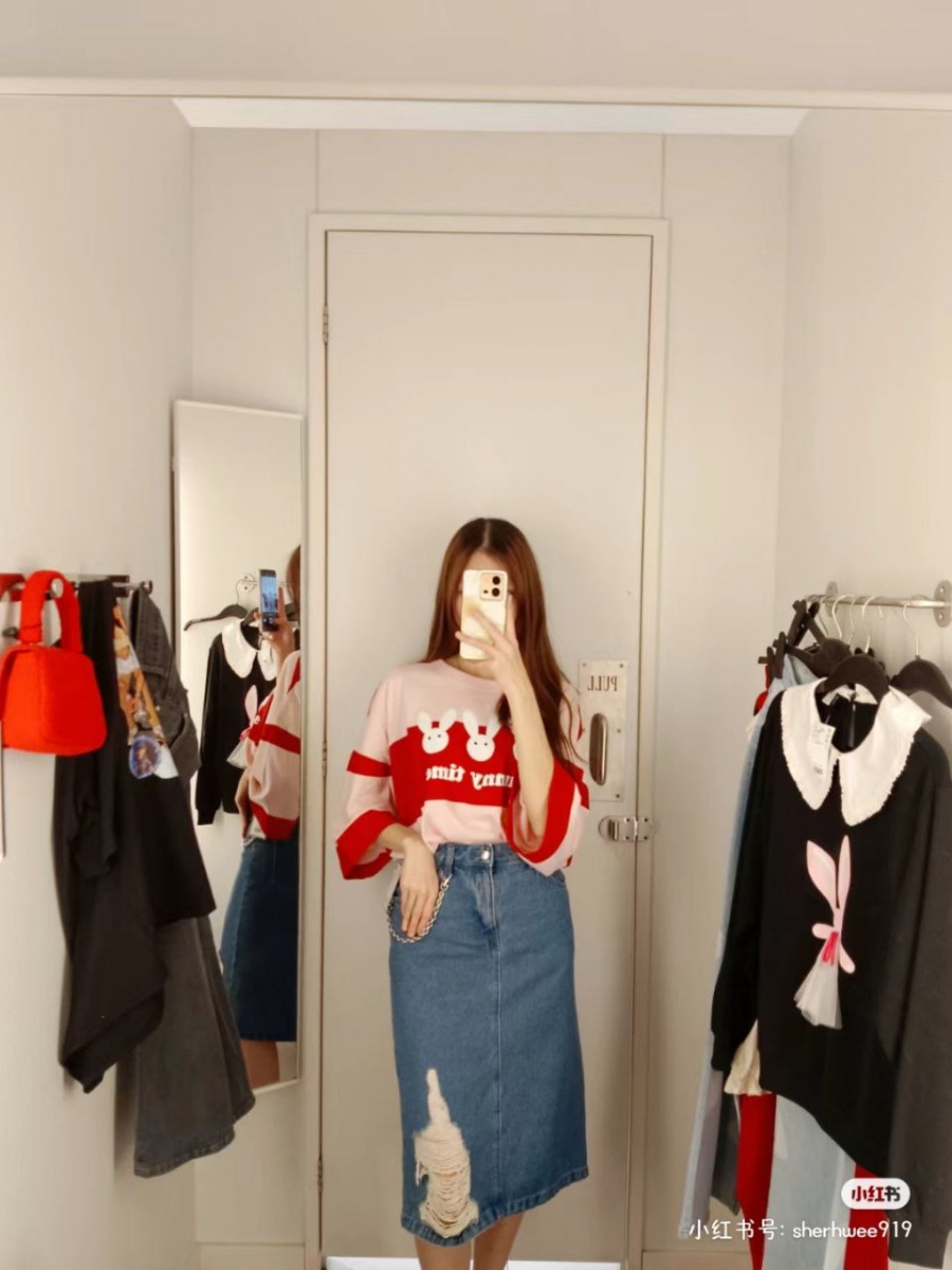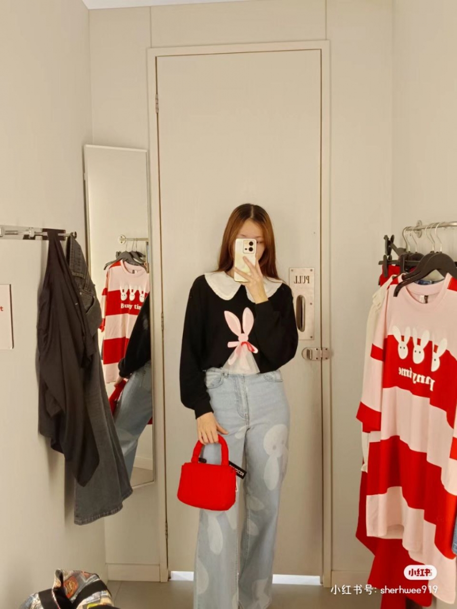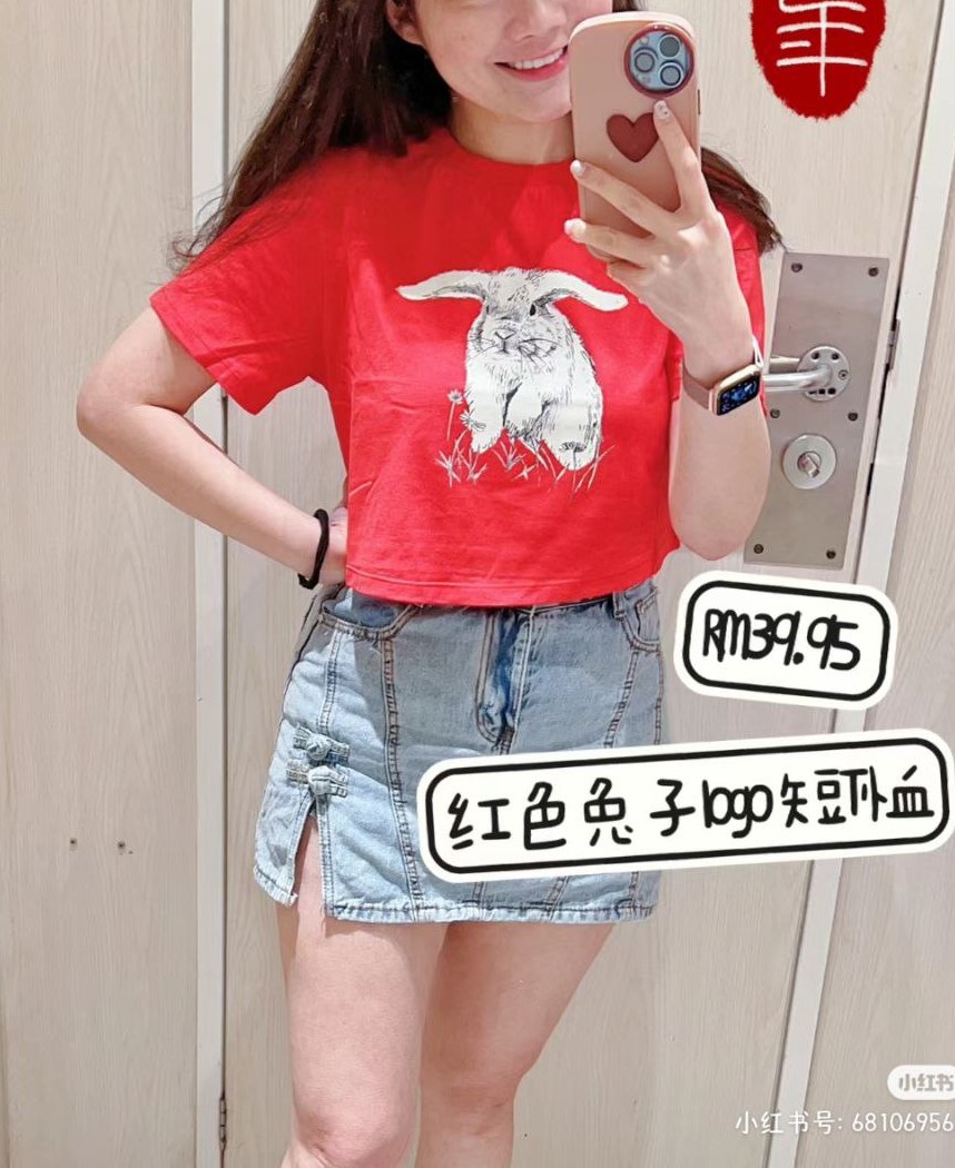 生活在天气炎热的马来西亚,T恤一定是每个人的衣柜必备单品!简单的红色T恤上面有一只栩栩如生的小白兔,随便搭一件短裤/ 短裙之类的就可以去拜年啦~ 清爽自在的搭配真滴很不错~