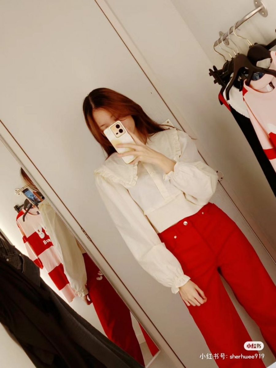 穿腻了中性色的下装,偶尔来一件跳 tone 的搭配也很不错~ 正红色的长裤元气满满,超适合新年,微喇的版型带出复古的味道,更能修饰粗壮小腿~ 由于裤子已经足够抢眼了,上衣可以选择设计和颜色都偏简单的,和下半身形成强烈的对比,会显得气色更好哦!
