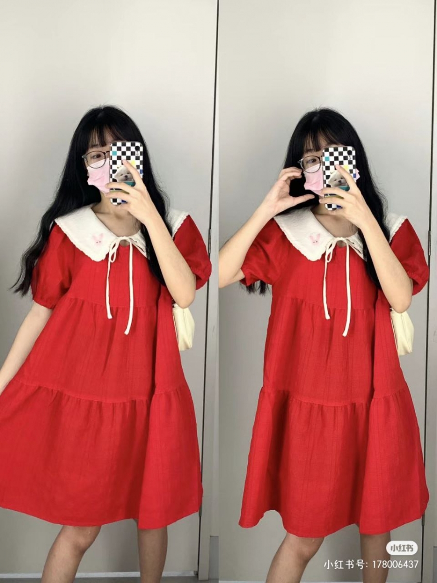 正红色的蛋糕裙搭配娃娃领,视觉效果超减龄!两边的娃娃领都分别有一只兔子图案的设计,细节很加分~ 红色让人看起来元气满满、精气神超棒,初一穿它穿它~?