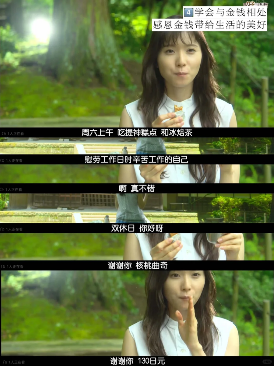 女主对金钱时时抱有感恩之心,在周末的时候给自己买一些小点心和饮料,她会细细品味,默默地说「谢谢你,核桃曲奇。谢谢你,130 日元」