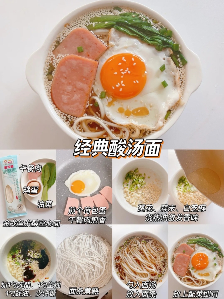 午餐肉煎香,鸡蛋煎成荷包蛋。碗里放入葱花、蒜末和白芝麻,用热油激发香味。加1勺陈醋、1勺生抽、1勺蚝油、少许糖搅匀。另起锅下入面条煮熟,捞入碗中。最后加上煎好的午餐肉、荷包蛋和青菜,就可以吃啦!