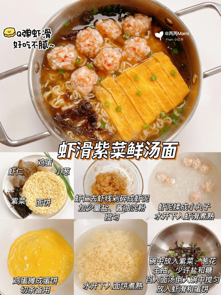 虾仁去虾线剁碎,加少量盐和酱油搅拌成虾泥。用勺子将虾泥挖成小丸子,下入沸水煮熟。鸡蛋打散煎成蛋饼,切条备用。水开下入面条煮熟。碗中放紫菜、葱花、生抽、少许盐和胡椒粉,将煮好的面条、虾滑和蛋饼一起倒入碗中,就可以吃啦!