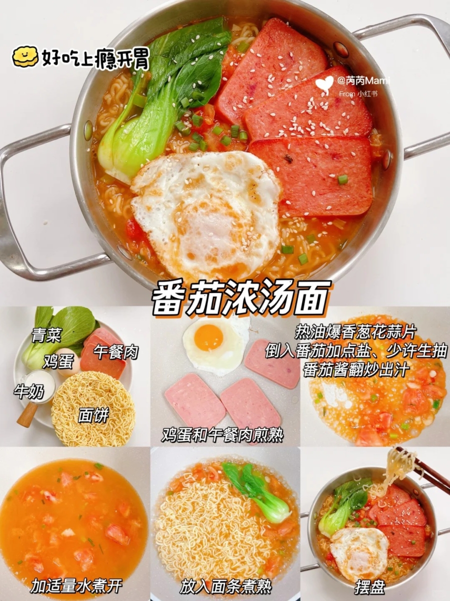 鸡蛋和午餐肉煎熟备用。热油爆香葱花蒜末,倒入番茄炒至出汁,加入适量水煮开。下入面条煮熟。最后加青菜、牛奶,撒盐和生抽调味,搭配煎好的鸡蛋、午餐肉,就完成啦!