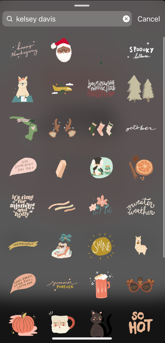 最后,我们要推荐的是风格独树一帜的 kelsey davis。这位创作者的风格带有一种美式复古和波西米亚的混合风情。这里的圣诞老人不再是传统的模样;还有化身杯子的圣诞老人和各种手写体的英文短句。如果你的穿搭风格偏向复古或文艺,或者你想发一张很有个性的自拍,这些带着一点点搞怪和艺术感的GIF会是你的最佳拍档。