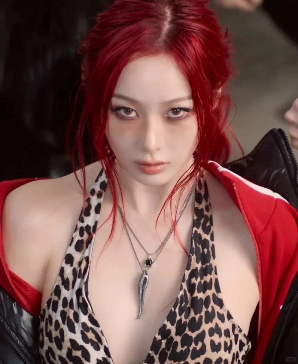 想要在新的一年突破自我,走辣妹路线的姐妹可以参考 aespa Giselle 的这款红宝石发色。高明度的红色配上她标志性的豹纹上衣,瞬间拉满狂野性感的氛围,非常有“大女主”的气场。这款发色不仅显白,更带有一种自信张扬的能量,寓意着新的一年红红火火,气势如虹。
