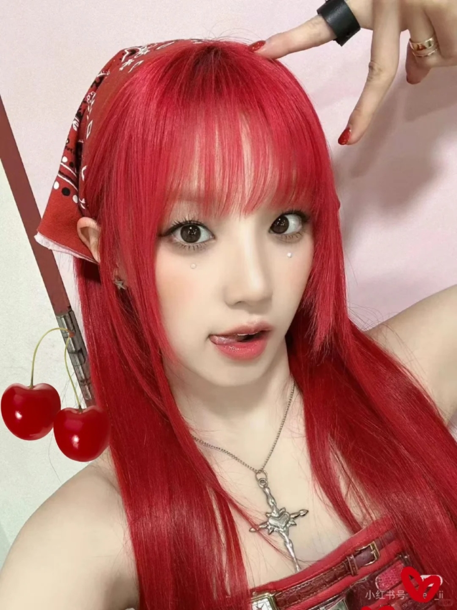 i-dle 宋雨琦的这款红发色泽浓郁,搭配俏皮的妆容和樱桃配饰,简直就是千禧辣妹风的教科书。这种高饱和度的樱桃红非常抢眼,能瞬间打破冬日的沉闷感,让你化身活力小太阳。新年换上这款发色,寓意着生活红火甜美,走到哪里都是开心果~
