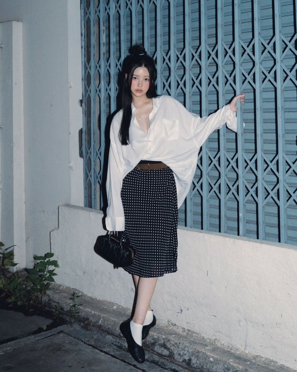 这套穿搭将复古与随性巧妙融合,打造出一种不经意的时髦感!一件 oversized 的白色衬衫,随性地扎进高腰的波点五分裙中,既拉长了腿部比例,又营造出慵懒又精致的氛围感。裙身经典的小波点图案,为整体造型增添了几分俏皮与灵动。搭配一双黑色乐福鞋和独特的白色短袜,让学院风的魅力瞬间升级!再配上宽腰带,为这身穿搭注入了更多层次感~